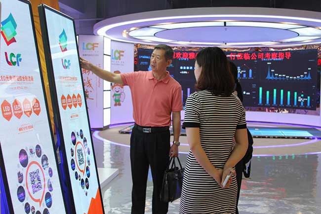 轻薄新颖、操作简单的镜子屏面前,正显示着LCF产品的应用领域与案例赏析,高清的动态图文,带给了张晓新教授一行新奇的视觉体验。